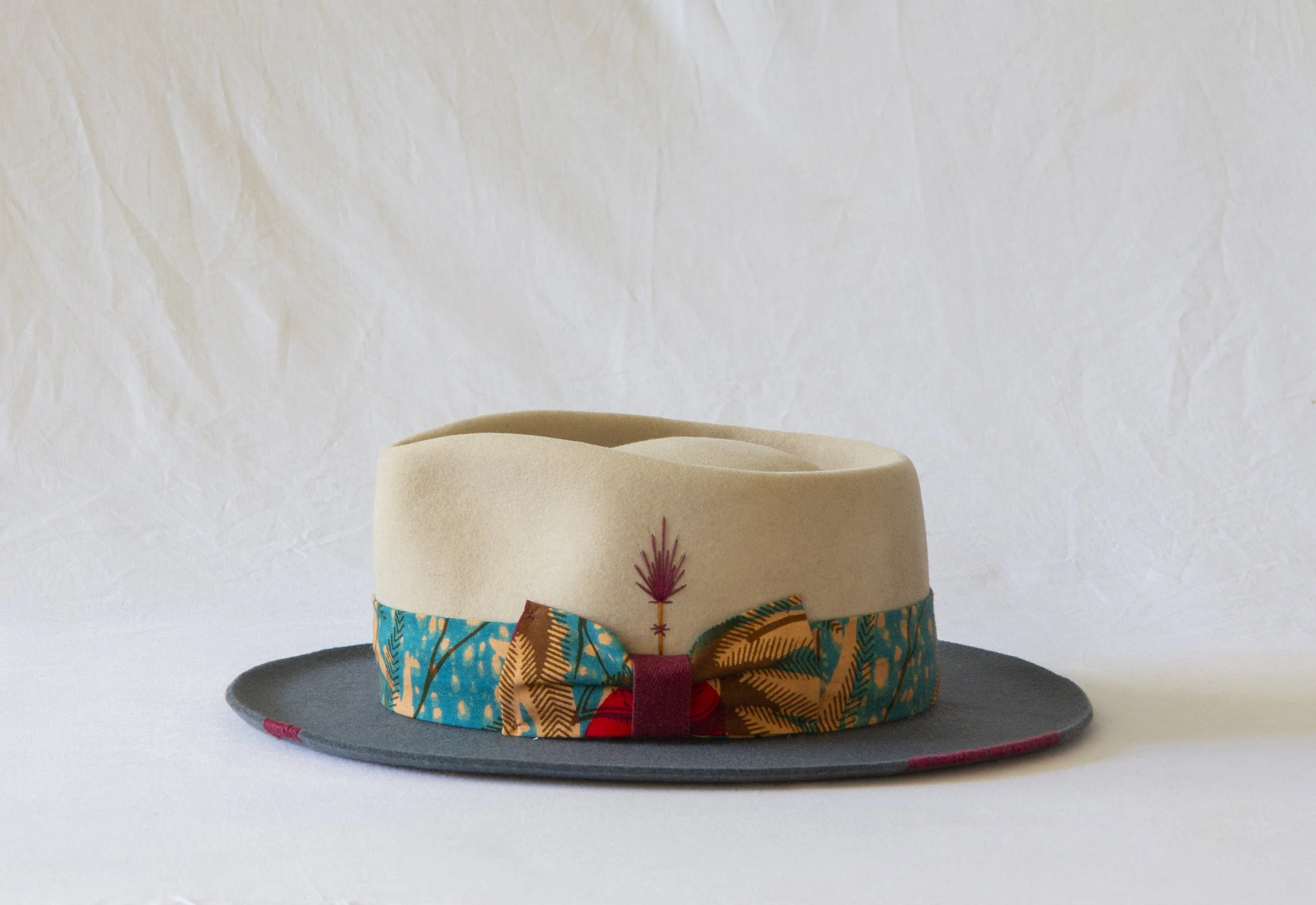 Handstitched brim binding and decoration